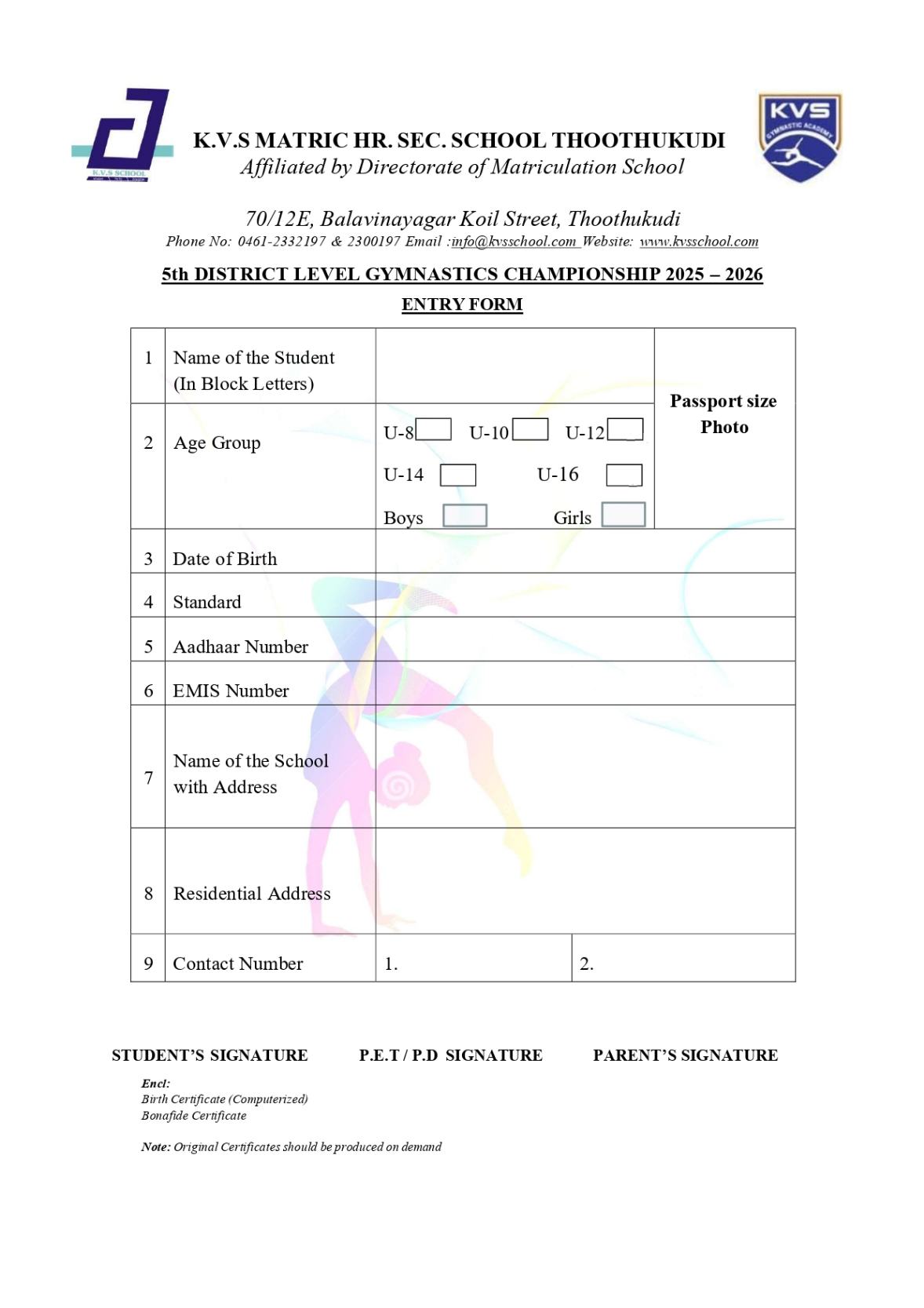 K.V.S School > AY 2025 - 2026 - February > 5th DISTRICT LEVEL GYMNASTICS ENTRY FORM