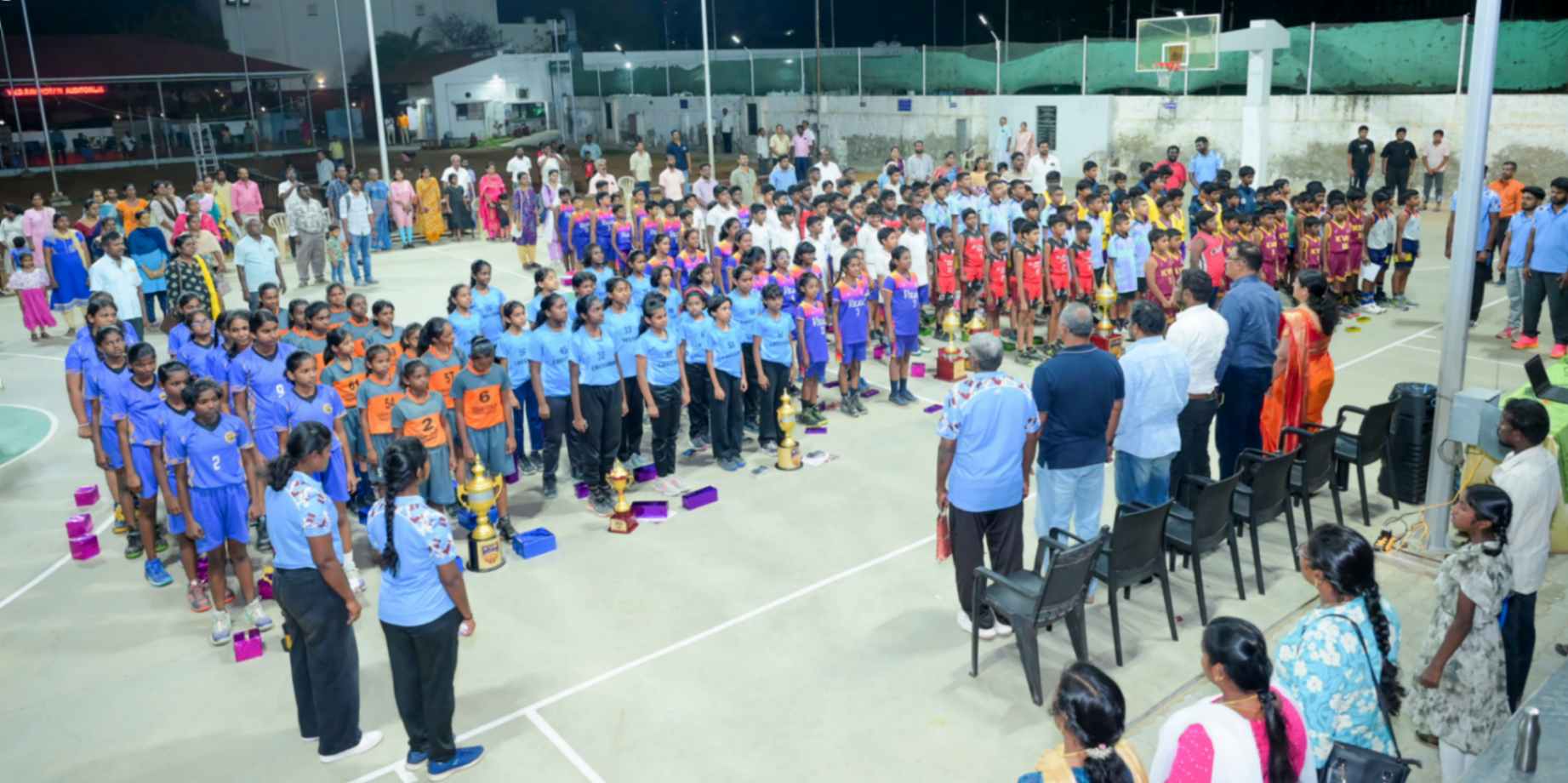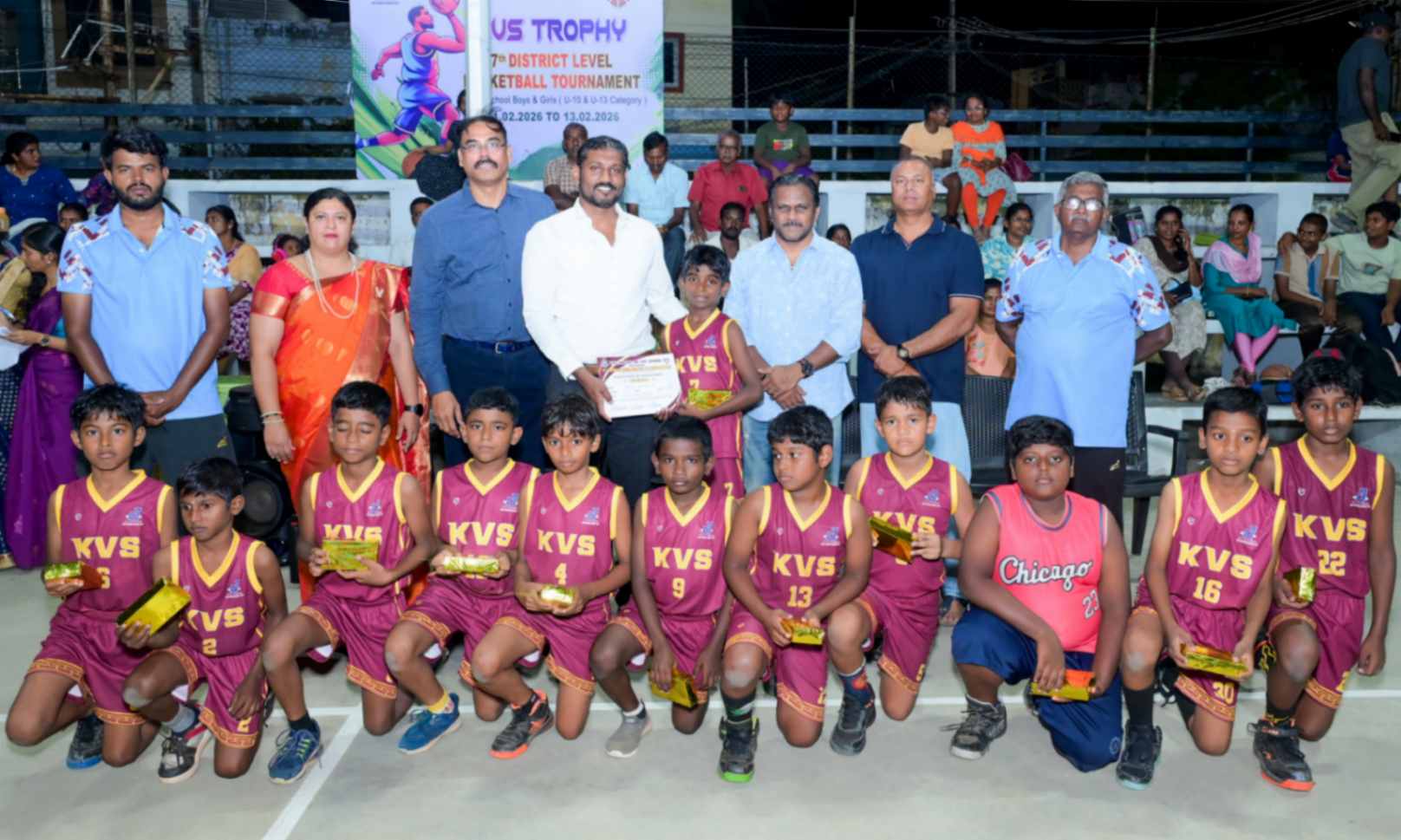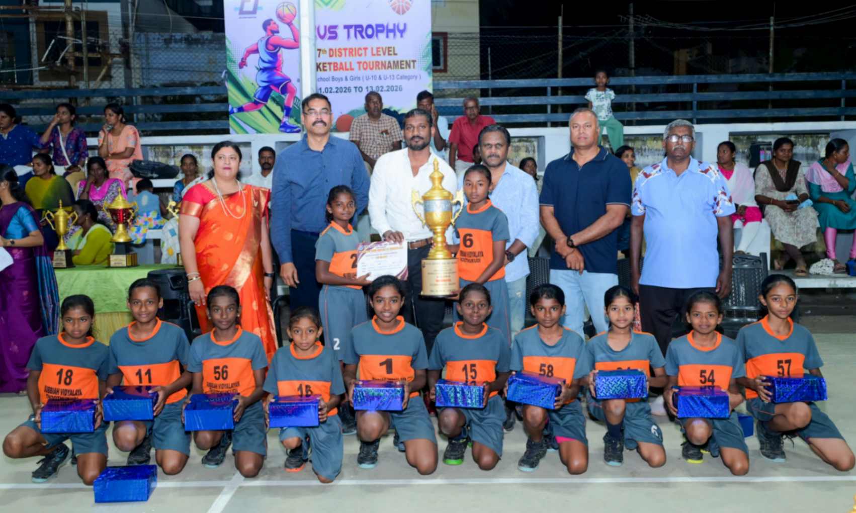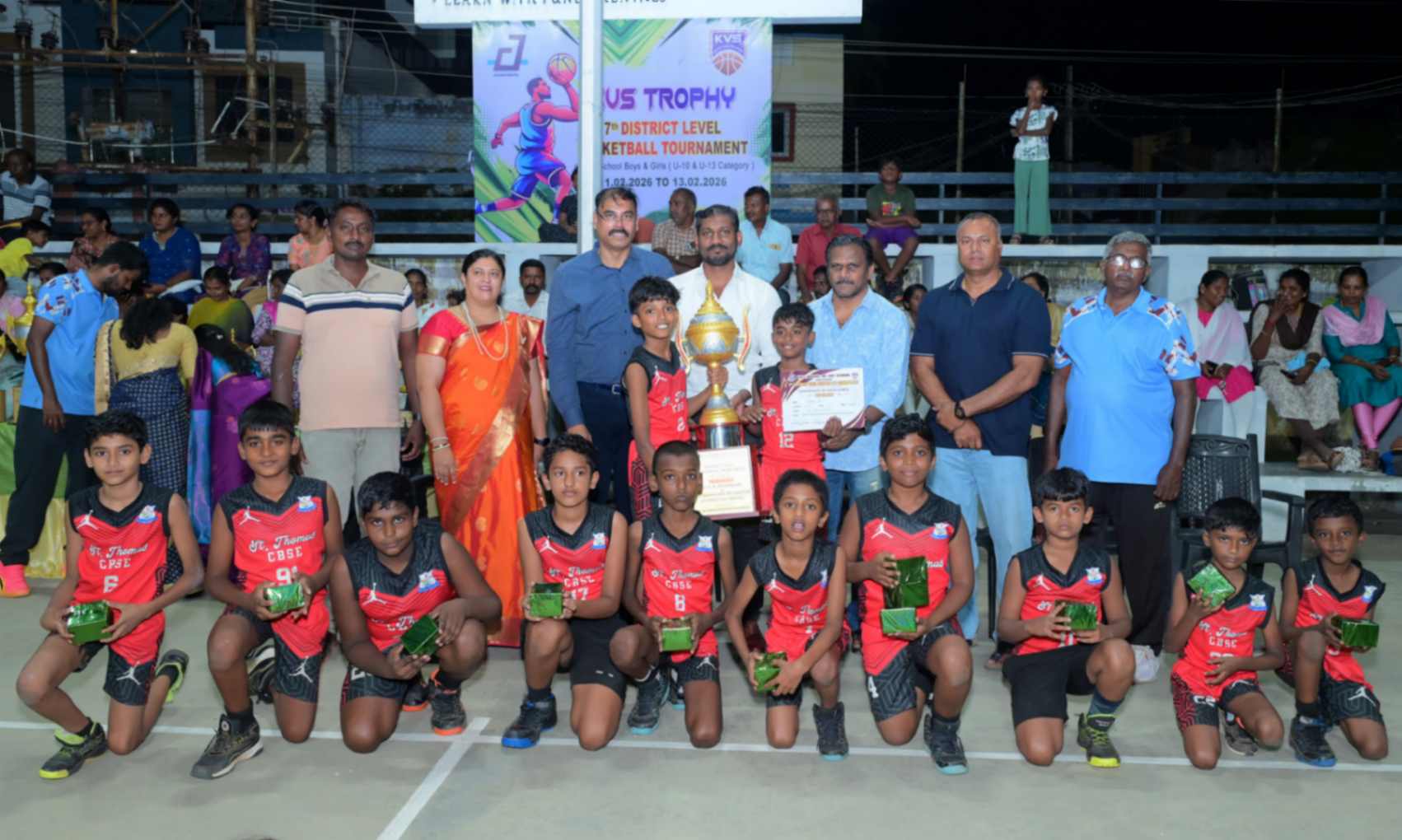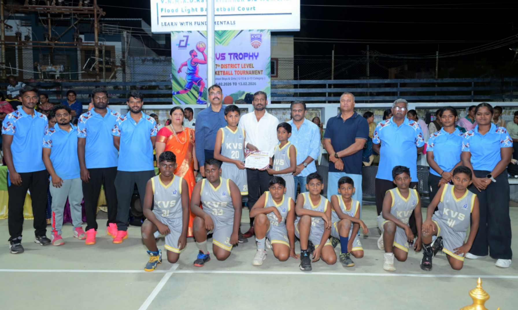 From 11.02.2026 to 13.02.2026, the 7th District Level Basketball Tournament for the KVS Trophy was successfully organized for school Boys and Girls under the U-10 and U-13 categories at the V.N.M.A.D. Ramakrishnan B.E Memorial Flood Light Basketball Court. The three-day tournament witnessed energetic participation from various schools, showcasing remarkable teamwork, sportsmanship, and competitive spirit. The valedictory function was held on 13.02.2026, with Mr. T. Vishakesh, Proprietor, M/s. T.K.R. Sugars, Tuticorin, gracing the occasion as the Chief Guest and distributing the awards to the winners. The event concluded on a grand note, celebrating young talent and encouraging students to excel in sports.