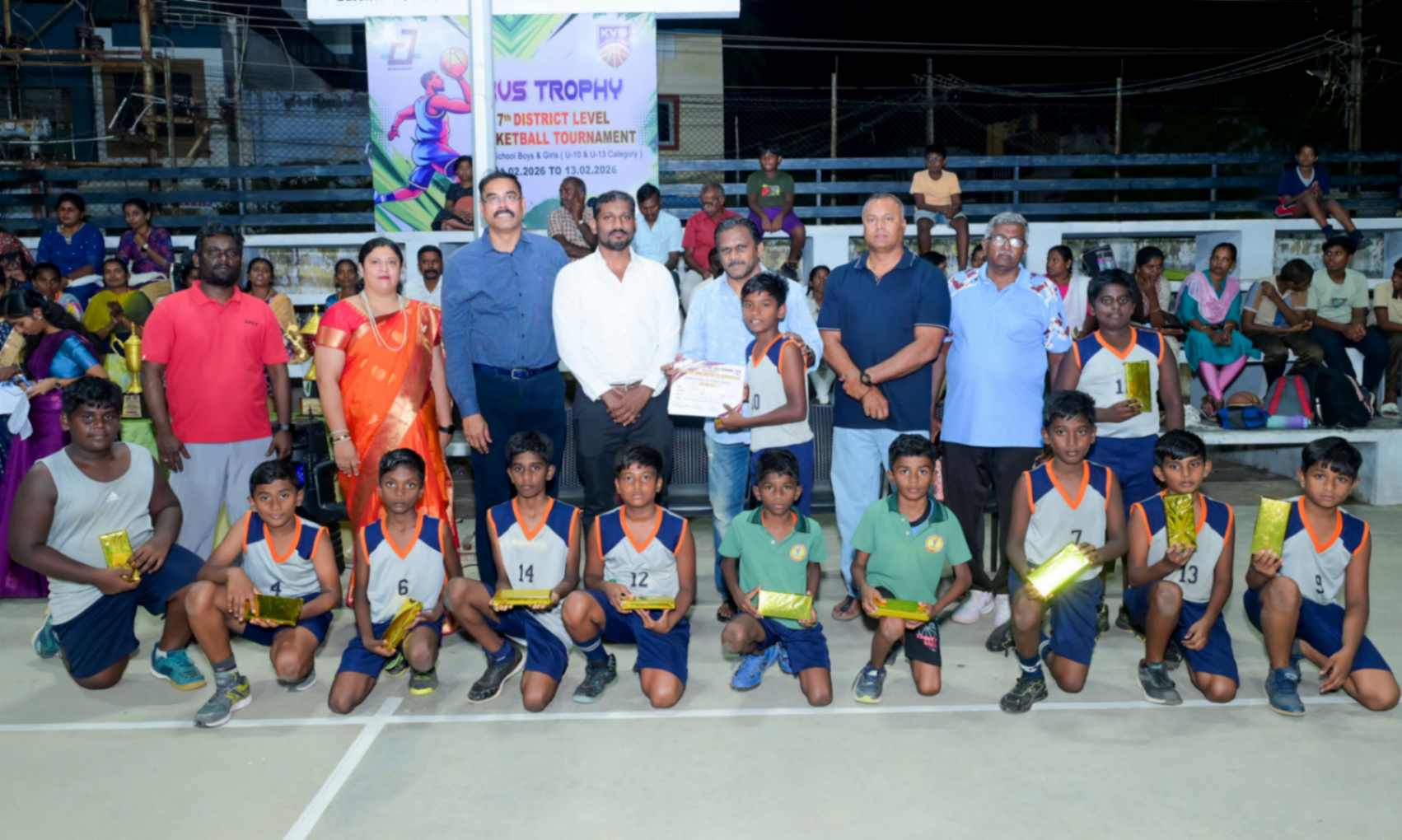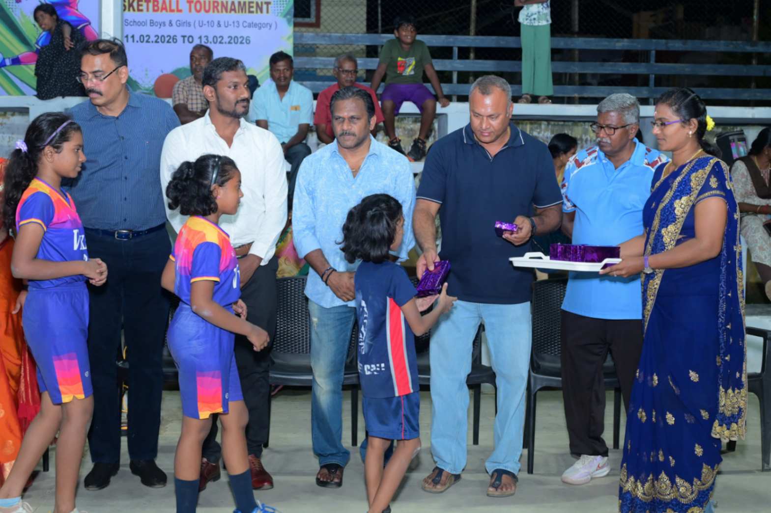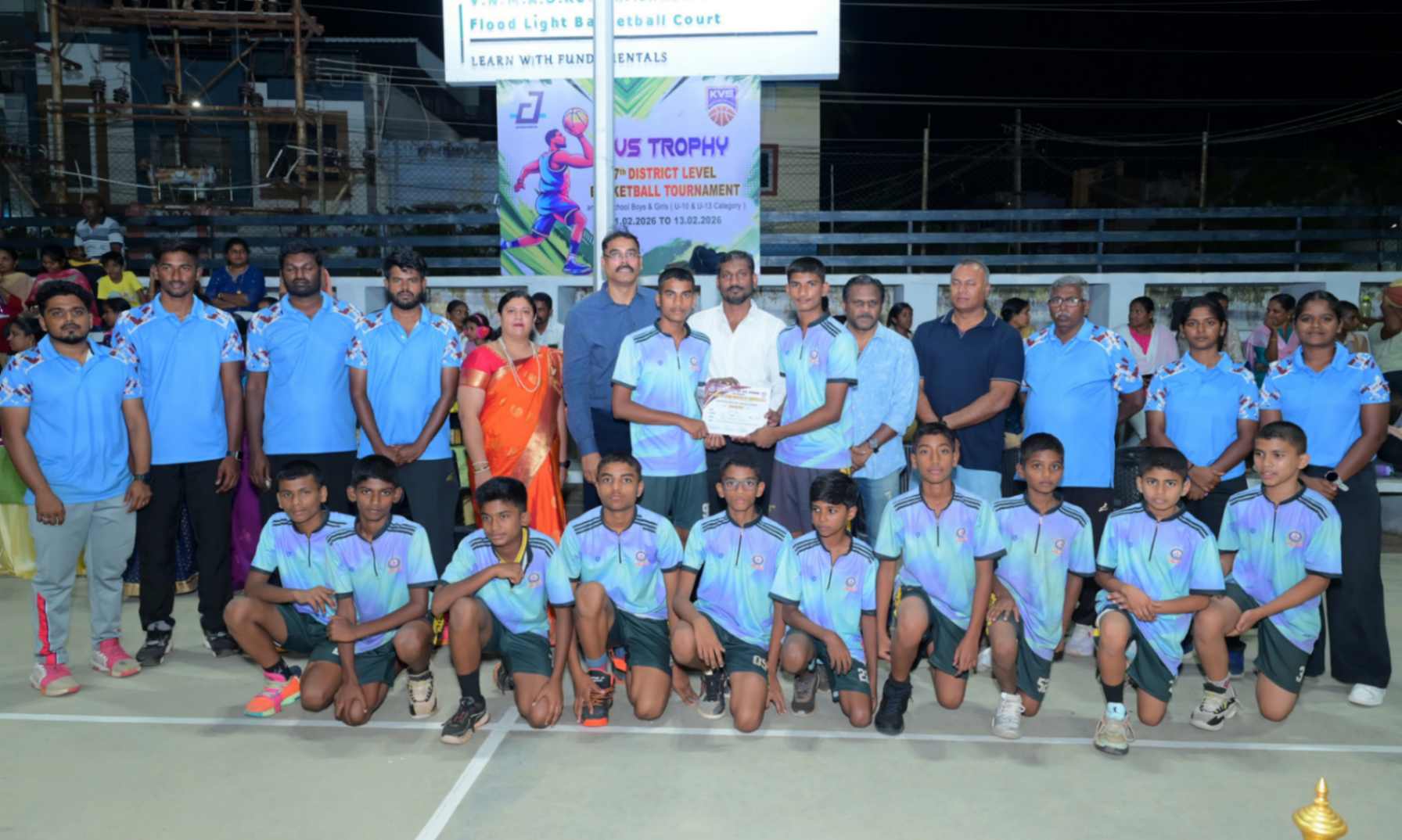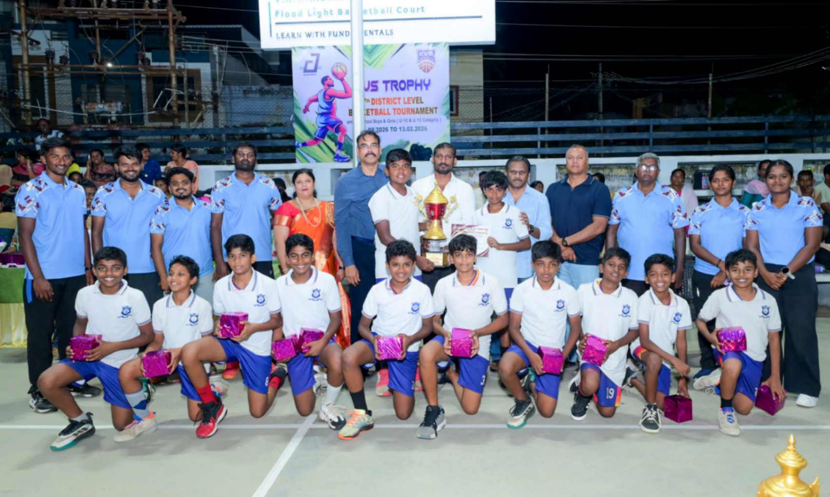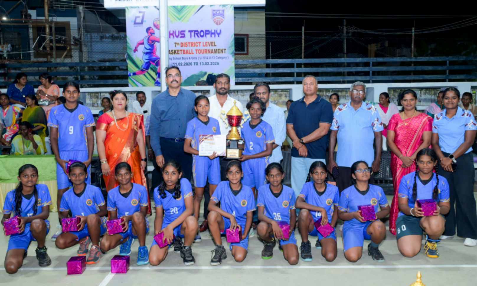 From 11.02.2026 to 13.02.2026, the 7th District Level Basketball Tournament for the KVS Trophy was successfully organized for school Boys and Girls under the U-10 and U-13 categories at the V.N.M.A.D. Ramakrishnan B.E Memorial Flood Light Basketball Court. The three-day tournament witnessed energetic participation from various schools, showcasing remarkable teamwork, sportsmanship, and competitive spirit. The valedictory function was held on 13.02.2026, with Mr. T. Vishakesh, Proprietor, M/s. T.K.R. Sugars, Tuticorin, gracing the occasion as the Chief Guest and distributing the awards to the winners. The event concluded on a grand note, celebrating young talent and encouraging students to excel in sports.